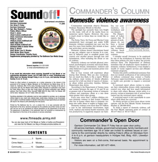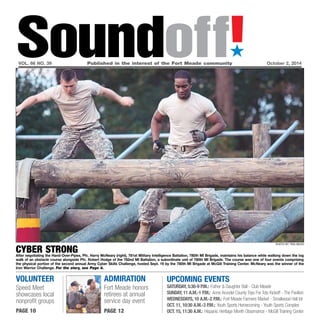 This document is a newspaper called Soundoff! that provides news and information to the Fort Meade community. The main article summarizes an annual Army Cyber Skills Challenge competition hosted by the 780th Military Intelligence Brigade at Fort Meade. The competition tested 53 soldiers and civilians from various cyber units on both physical obstacles like a 4.5 mile ruck march and technical challenges like packet analysis. Pfc. Harry McNeary from the 781st Military Intelligence Battalion won the Iron Warrior portion of the physical competition. The event was designed to challenge participants both physically and mentally.