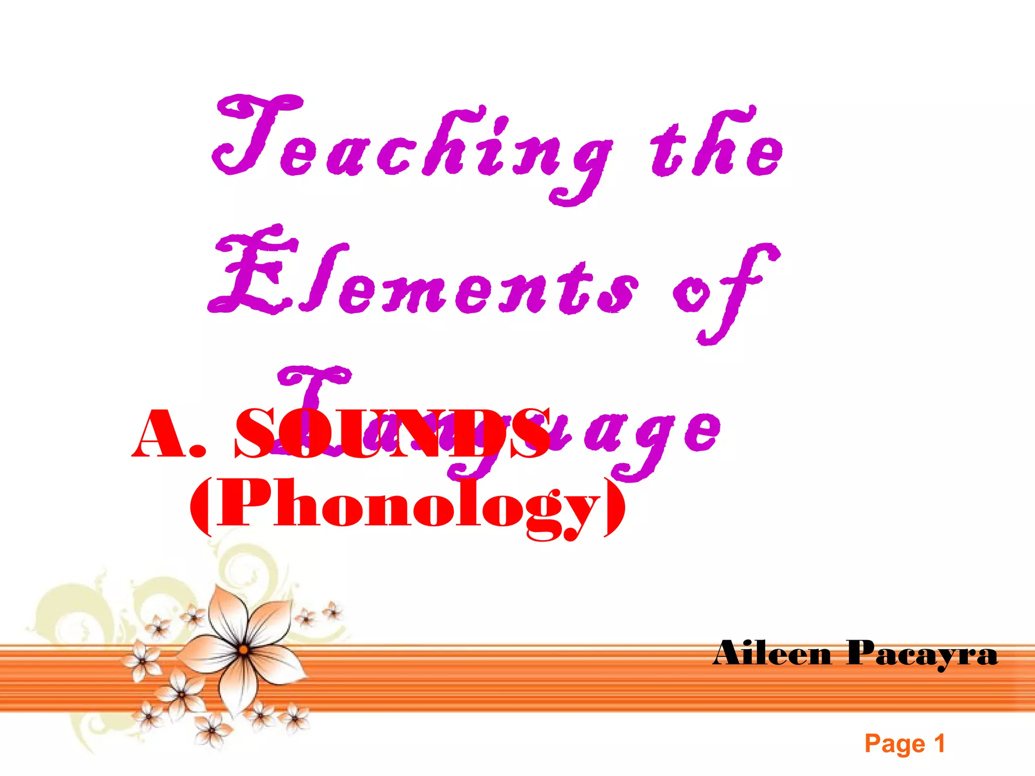 This document provides an overview of teaching the elements of language, focusing on sounds (phonology). It defines phonology and phonetics, and classifies consonant and vowel sounds according to their voicing, place of articulation, and manner of articulation. Consonant sounds are further categorized in tables with their corresponding IPA symbols. Vowel sounds are described based on tongue placement, position, tenseness, and lip rounding, and examples are provided in a table with IPA symbols. The International Phonetic Alphabet is introduced for representing sounds in writing.