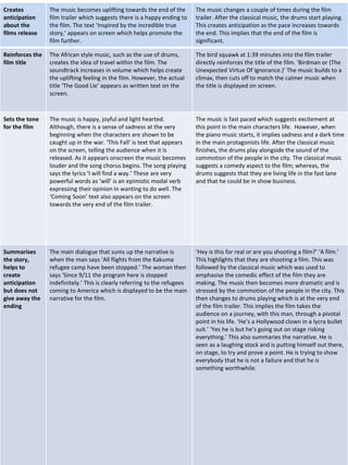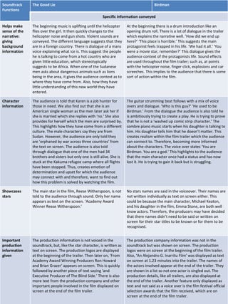 The document analyzes the soundtracks of two movie trailers, The Good Lie and Birdman. For The Good Lie, the soundtrack uses uplifting African music to set the scene and introduces the main characters as refugees from Sudan. For Birdman, the soundtrack shifts between classical and drum music to represent the protagonist's changing mood and life situation as a former celebrity struggling in the present. Both soundtracks effectively summarize the films' stories through music and dialogue without revealing the endings.
