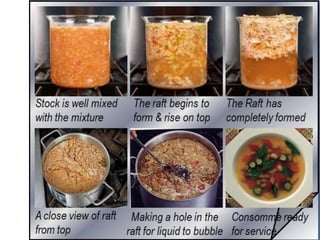 This document provides definitions and classifications for different types of soups. It discusses thin soups like broth and consommé, thick soups like puree, cream, veloute, bisque and chowder. It also covers cold soups, international soups, and accompaniments and garnishes for soups. Key points covered include the clarification process for making consommé, different varieties of consommé, and proper temperatures for serving hot and cold soups.