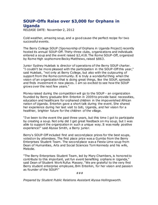 Thirty-three clubs, organizations and individuals at Berry College and Rome High School entered soups in their respective SOUP-Off competitions, raising over $3,000 total to support orphans in Uganda through the Sponsorship of Orphans in Uganda Project (SOUP). Junior Sydney Hulebak, director of operations of the Berry SOUP charter, was pleased with the high participation levels and support from both the Berry and Rome communities. The money raised will go to the SOUP organization founded by Berry graduate Brin Enterkin in 2009 to provide necessities, education and healthcare for orphaned children in Uganda.