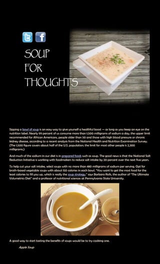 Consuming soup can be healthy if sodium levels are monitored, as the majority of Americans exceed the recommended daily limit for sodium. The National Salt Reduction Initiative aims to decrease salt in foods by 20% over five years, and it is advised to choose soups with less than 480 mg of sodium. A recipe for apple soup is provided, featuring ingredients like apples, white bread, and sour cream.