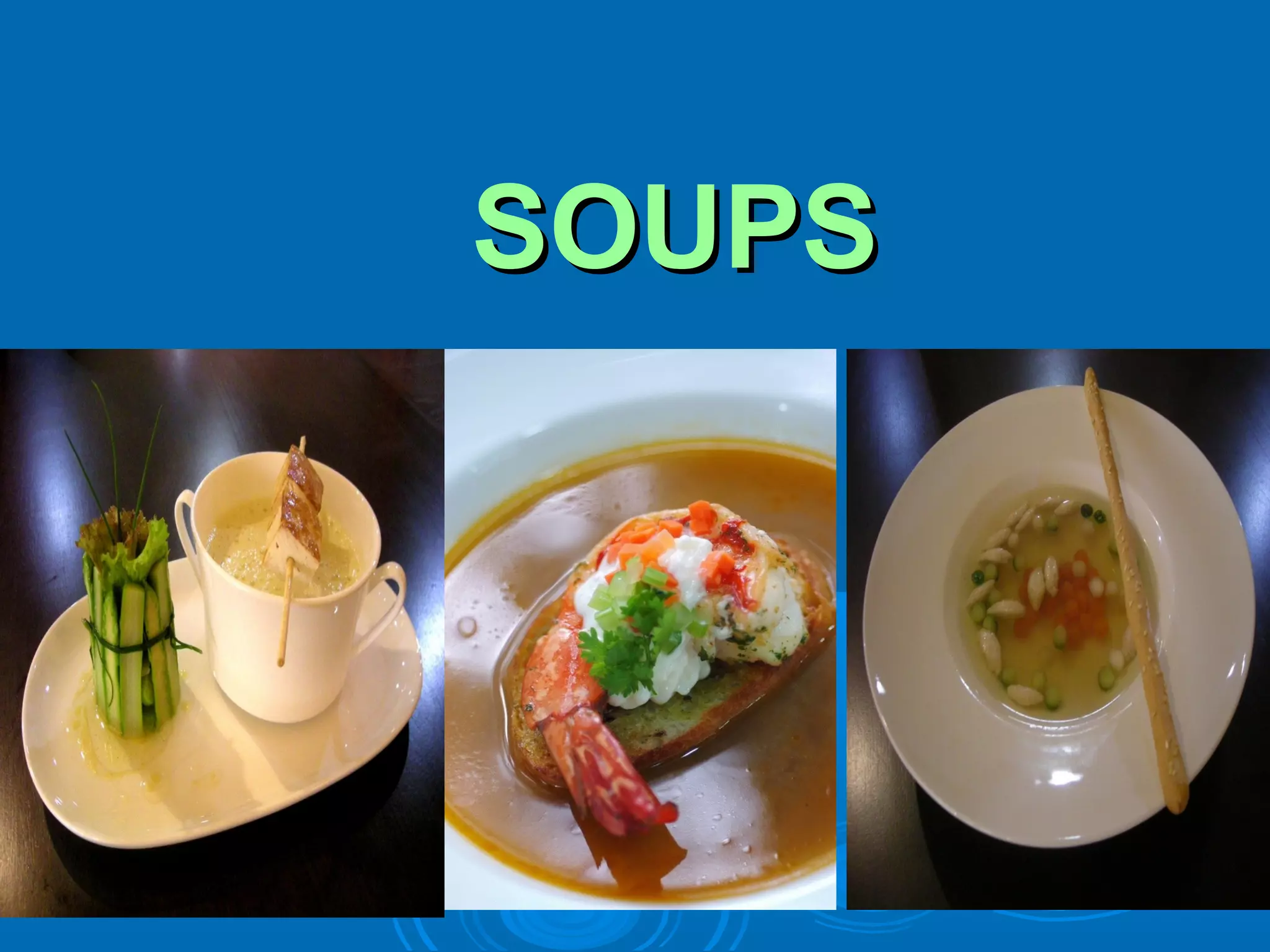 This document provides information about different types of soups. It discusses clear soups such as broths, bouillons, and consommés which are based on a clear stock. It also covers thick soups such as cream soups, pureed soups, chowders, and bisques. Specialty soups and national soups from around the world are also mentioned. The document provides details on techniques for making consommés and standards for quality cream soups. It concludes with notes on serving portions of soups and appropriate garnishes.