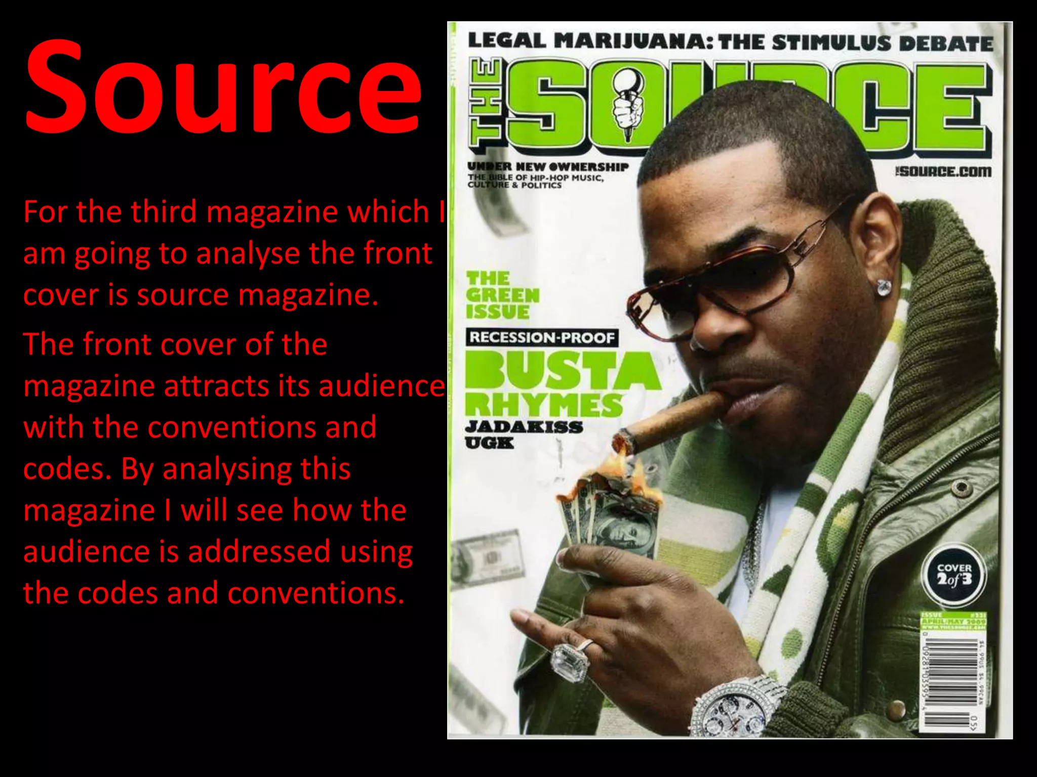 The document summarizes the target audience of Source magazine based on information from its cover and media kit. The target audience is predominantly male, African American, aged 18-44, well-educated and living in urban areas. They enjoy hip hop music, films, celebrities, technology and fashion. The magazine's cover uses conventions like images of famous rappers and headlines about music, politics and money to attract its core audience of dedicated hip hop fans.