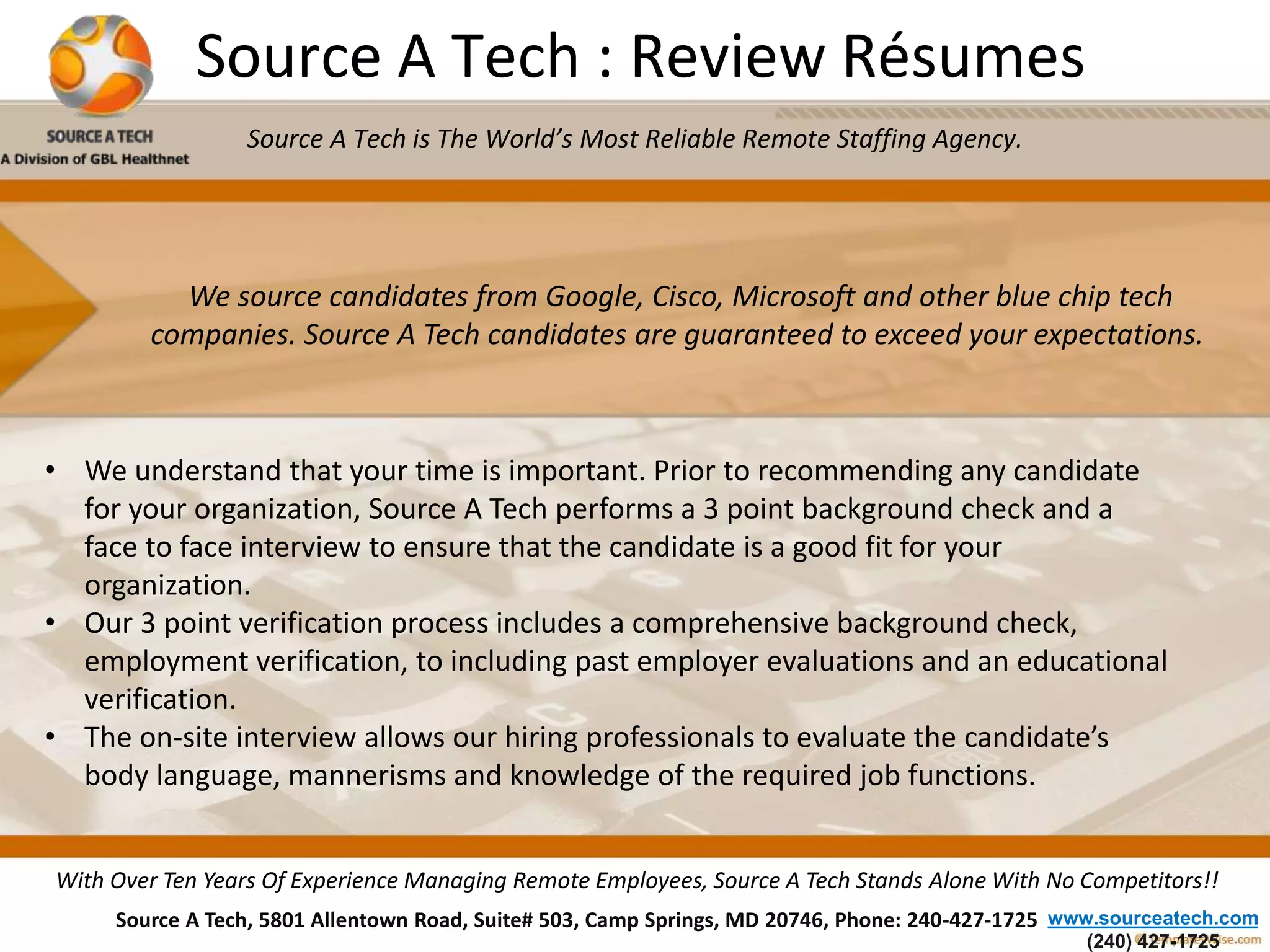 Source A Tech is a remote staffing agency that sources candidates from major tech companies like Google, Cisco, and Microsoft. They perform a thorough 3-point verification process on candidates, including background checks, employment and education verification, and an in-person interview to evaluate candidates' fit for clients. With over ten years of experience managing remote employees, Source A Tech guarantees its candidates will exceed clients' expectations.