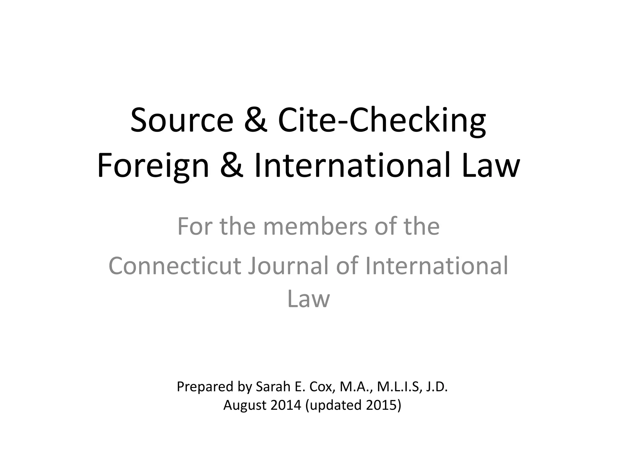 This document provides guidance for source and citation checking for the Connecticut Journal of International Law. It outlines a 3-step process for verification of citations, finding sources, and obtaining sources. It recommends using the LibGuide and consulting reference librarians for assistance in navigating foreign and international legal research and verifying that citations are accurate.