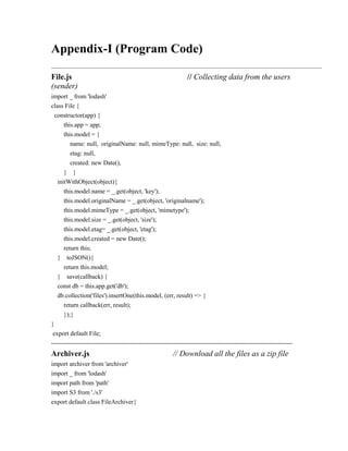 This document contains code for a file sharing application that allows users to upload files to Amazon S3 storage and send download links to recipients via email. It includes code for connecting to MongoDB and S3 databases, handling file uploads with Multer, generating signed URLs with AWS, sending emails with Nodemailer, and building APIs with Express. The React code handles form inputs, file previews, and confirming upload status.