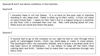 The document provides guidance on answering National 5 history source comparison questions. It explains that these questions ask students to compare two historical sources on a given topic and identify both similarities and differences. The document demonstrates how to structure a model answer, noting agreements and providing evidence from both sources to earn multiple marks. It also provides examples of sources describing conditions in the trenches during World War I and a model answer comparing these sources.
