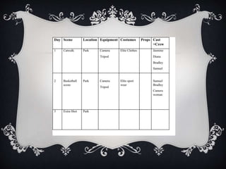 This document identifies potential hazards during the filming of a project, including slipping or tripping, getting hit by objects, collisions with bikes or trees. It rates the likelihood and severity of each hazard, then outlines measures to manage the risks, such as clearing objects, passing basketballs carefully, staying aware of surroundings. All identified risks were deemed manageable with the outlined prevention methods.