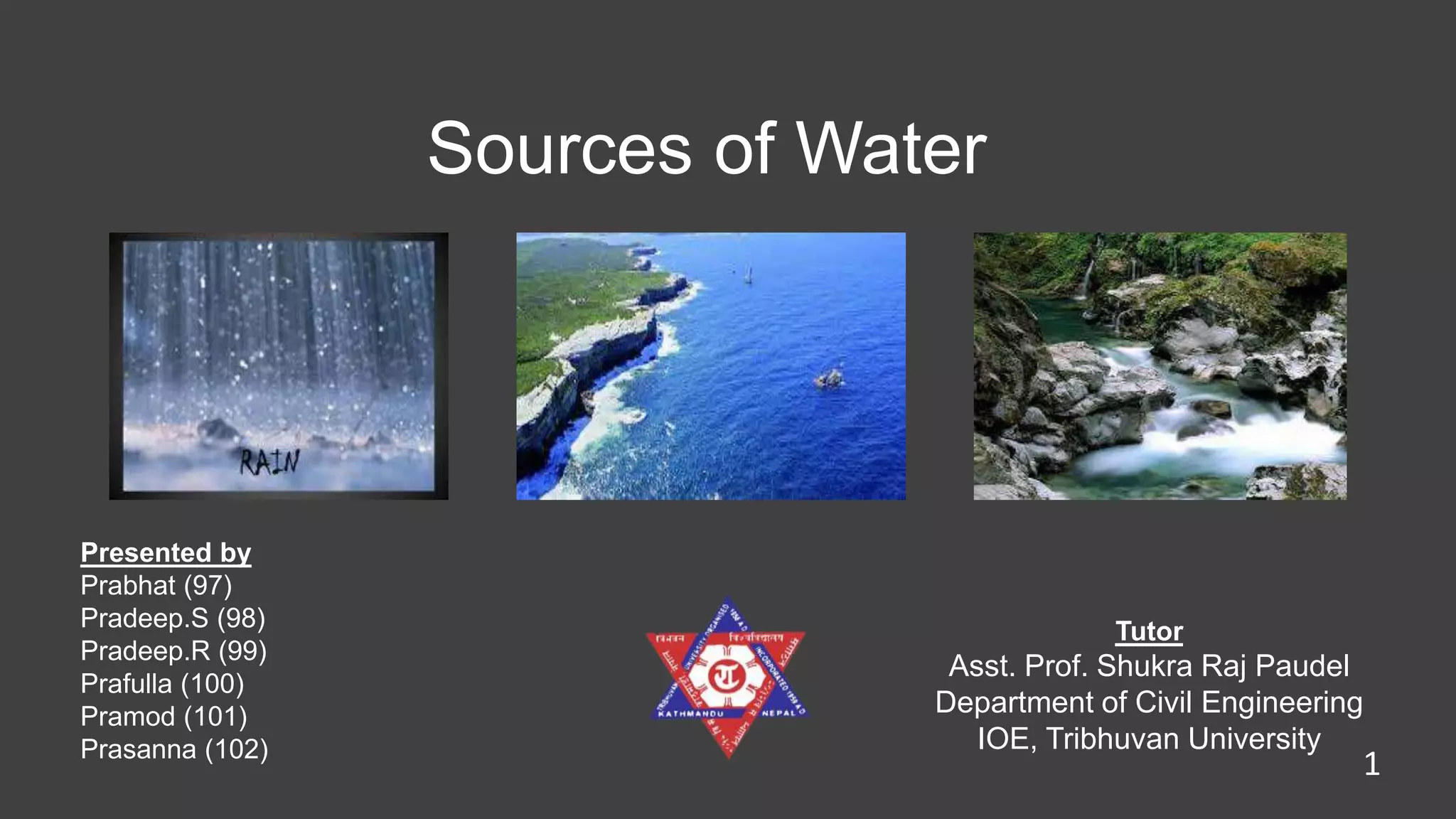 The document discusses various sources of water including surface water sources like rivers, streams, lakes, ponds and impounded reservoirs as well as groundwater sources like springs, wells, infiltration galleries and infiltration wells. It provides details on each source, including definitions, types, quality considerations and images. It also discusses subsurface geological formations like aquifers, aquitards and aquifuges. In summary, the document comprehensively covers different sources of water above and below the ground surface.