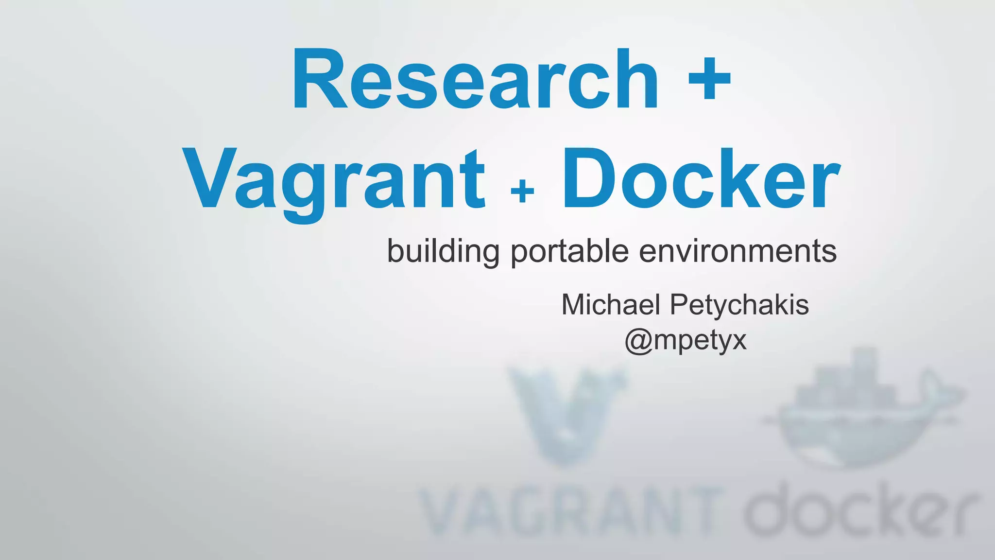 This document discusses using Vagrant and Docker together to build portable development environments. It provides an overview of Vagrant and Docker, including how Vagrant uses boxes and providers to manage virtual machines and containers. It then shows how to set up a sample Vagrantfile to provision a Docker container for development. Key steps include installing Vagrant, initializing a project directory, selecting a box, editing the Vagrantfile to specify the box and Docker configuration, and running vagrant up to launch the environment.