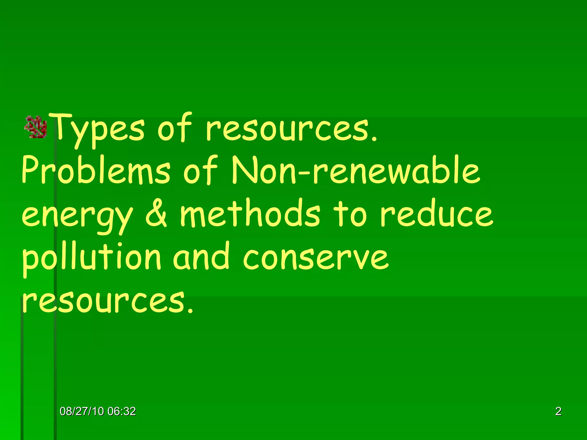 The document discusses various sources of energy, including renewable and non-renewable sources. It provides information on different types of non-renewable resources like coal, natural gas, and nuclear power. It also discusses renewable energy sources such as solar, wind, and geothermal energy. Additionally, it covers topics like acid rain, global warming, and ways to conserve resources and reduce pollution from energy production and usage.