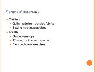 The South haven park district is offering new spring seminars for seniors, teens, and adults. For seniors, quilting seminars provide donated fabrics and sewing machines, while tai chi classes involve gentle warmups, 12 slow movements, and cool downs. Teens can take sailing to sail 30-foot boats in their first class or one of three levels of fencing. Adults can learn cooking techniques from a chef and enjoy dinners together in Almost Gourmet, or learn kickball techniques and rules.