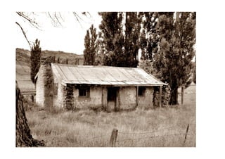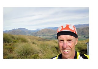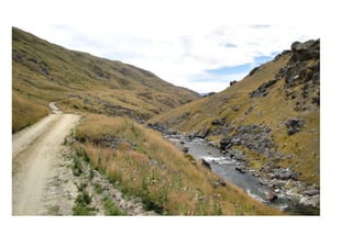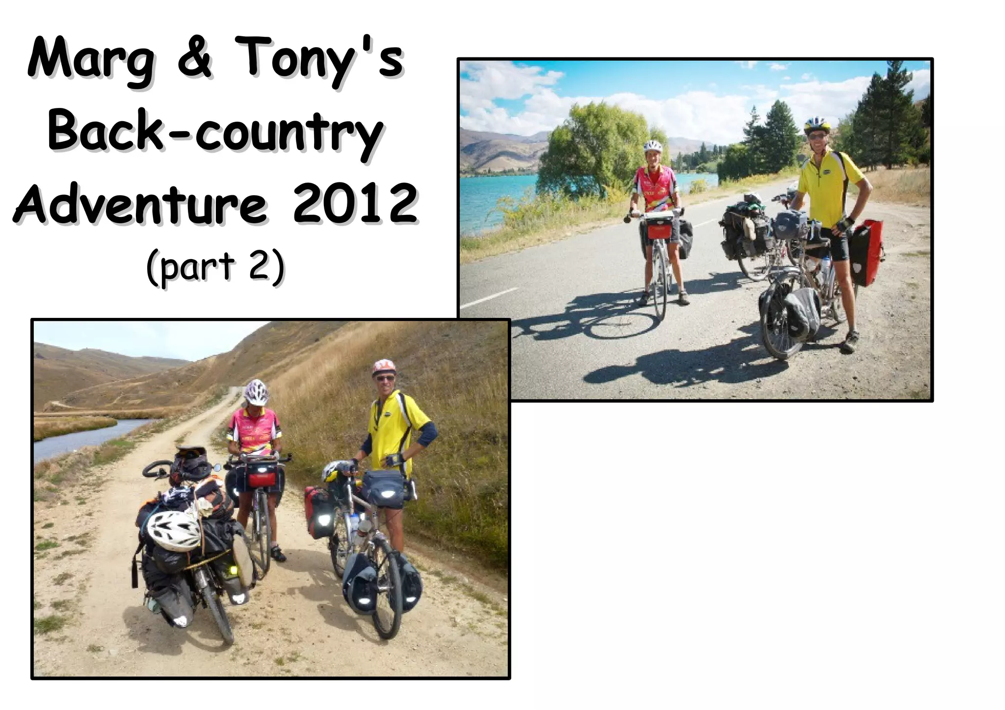 Marg & Tony documented their back-country adventure through Central Otago in 2012, which included stops at historic sites like Nicols' Blacksmiths Shop, climbs over mountain passes like Danseys Pass, and views of the countryside from places such as Manorburn Dam and Ben Nevis. They saw remnants of the past like the Kingston Flyer locomotive and old stone woolshed ruins, and explored parts of the Otago Central Rail Trail between activities like climbing Duffers Saddle.