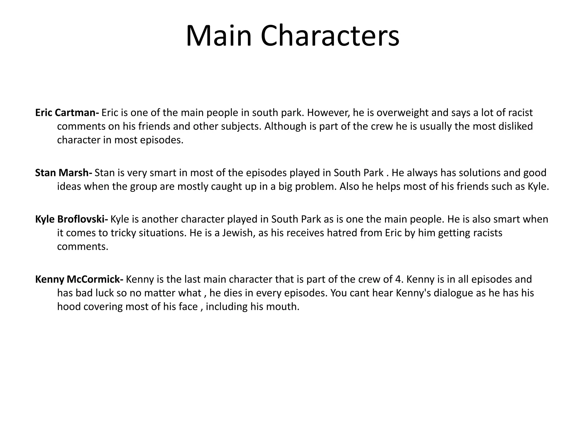 - The main characters Eric Cartman, Stan Marsh, Kyle Broflovski, and Kenny McCormick.