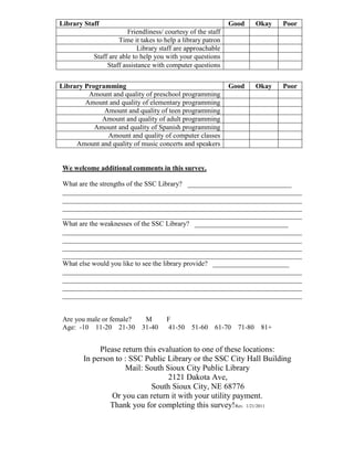 The South Sioux City Library is conducting an evaluation to better serve the citizens of South Sioux City and Dakota County. The evaluation asks respondents about their library card usage, satisfaction with library services, materials, staff, and programming. It also solicits comments on strengths, weaknesses, and desired additions. Respondents are asked to return the completed survey to the library or city hall, or with their utility payment.