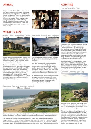This document provides information about activities and accommodations in Devon and Cornwall, England. It describes the regions' dramatic coastlines, beaches, and national parks. Several luxury hotel options are mentioned including Bovey Castle, Watergate Bay Hotel, and The Scarlet. Outdoor activities that could be part of an itinerary are also summarized, such as surfing lessons, sailing, cooking classes, golfing, and literary tours following authors like Agatha Christie. Eden Project is highlighted as a potential venue for a gala dinner with its biomes and gardens.
