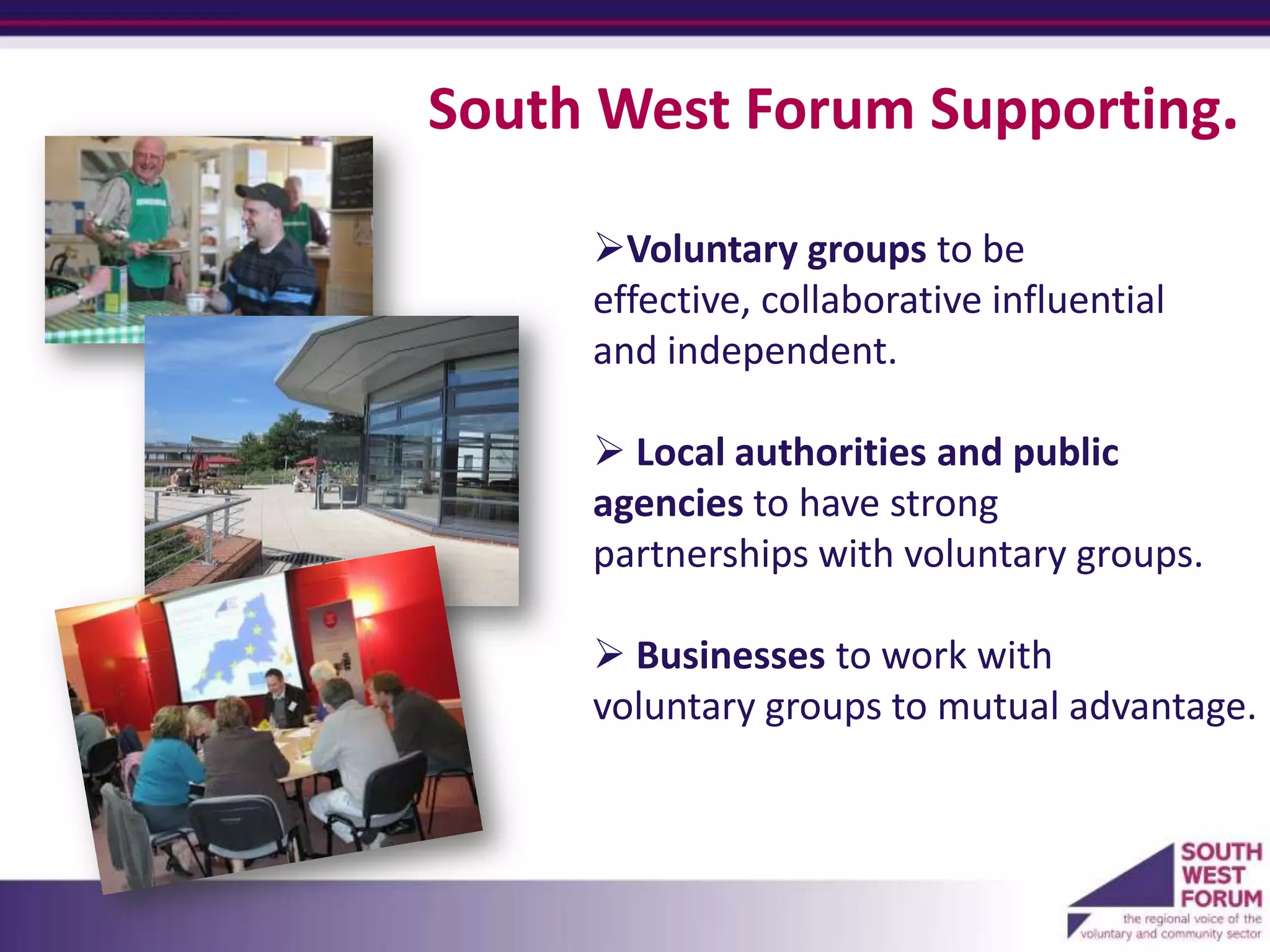 The South West Forum has been supporting over 70,000 social purpose organizations in the region since 2000. It provides services like conferences, workshops, networking opportunities, and advice on areas such as demonstrating impact, influencing policy, and developing partnerships. Recent work has focused on themes like the Big Society, health reform, and involving voluntary groups with Local Enterprise Partnerships. The Forum aims to strengthen and enable voluntary groups through supporting collaboration, communication, and representation of the sector's views.