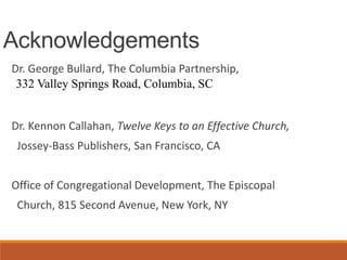 The document is a presentation by Dr. John Fairless for the Southeastern Synod Convocation, discussing the life cycle of churches including stages of birth, growth, maturity, decline, and death. It emphasizes the importance of vision, relationships, programs, and management in fostering effective congregations and outlines characteristics that contribute to a church's effectiveness. The presentation encourages congregations to focus on strengthening relational aspects while recognizing that functional characteristics contribute to satisfaction and dissatisfaction within the community.