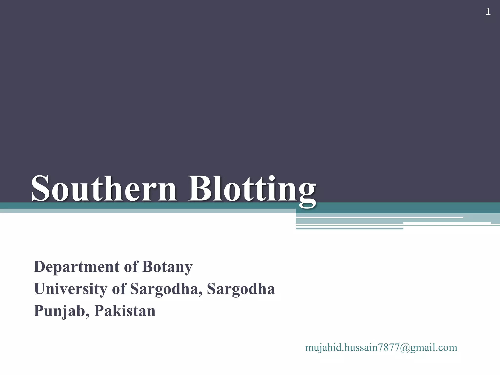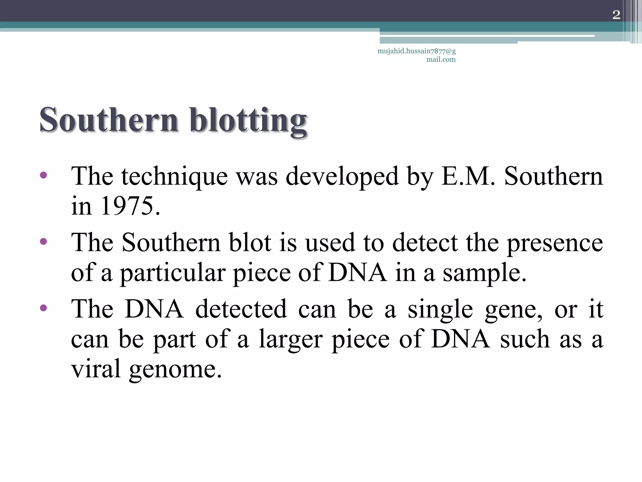 Southern blotting is a technique developed in 1975 to detect specific DNA fragments in a sample. The process involves DNA isolation, restriction digestion, gel electrophoresis, transfer to a membrane, and hybridization with a labeled probe. It has applications in genetic analysis, cancer prognosis, and DNA fingerprinting, although it is costly and labor-intensive.