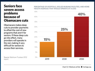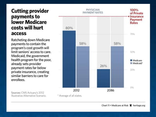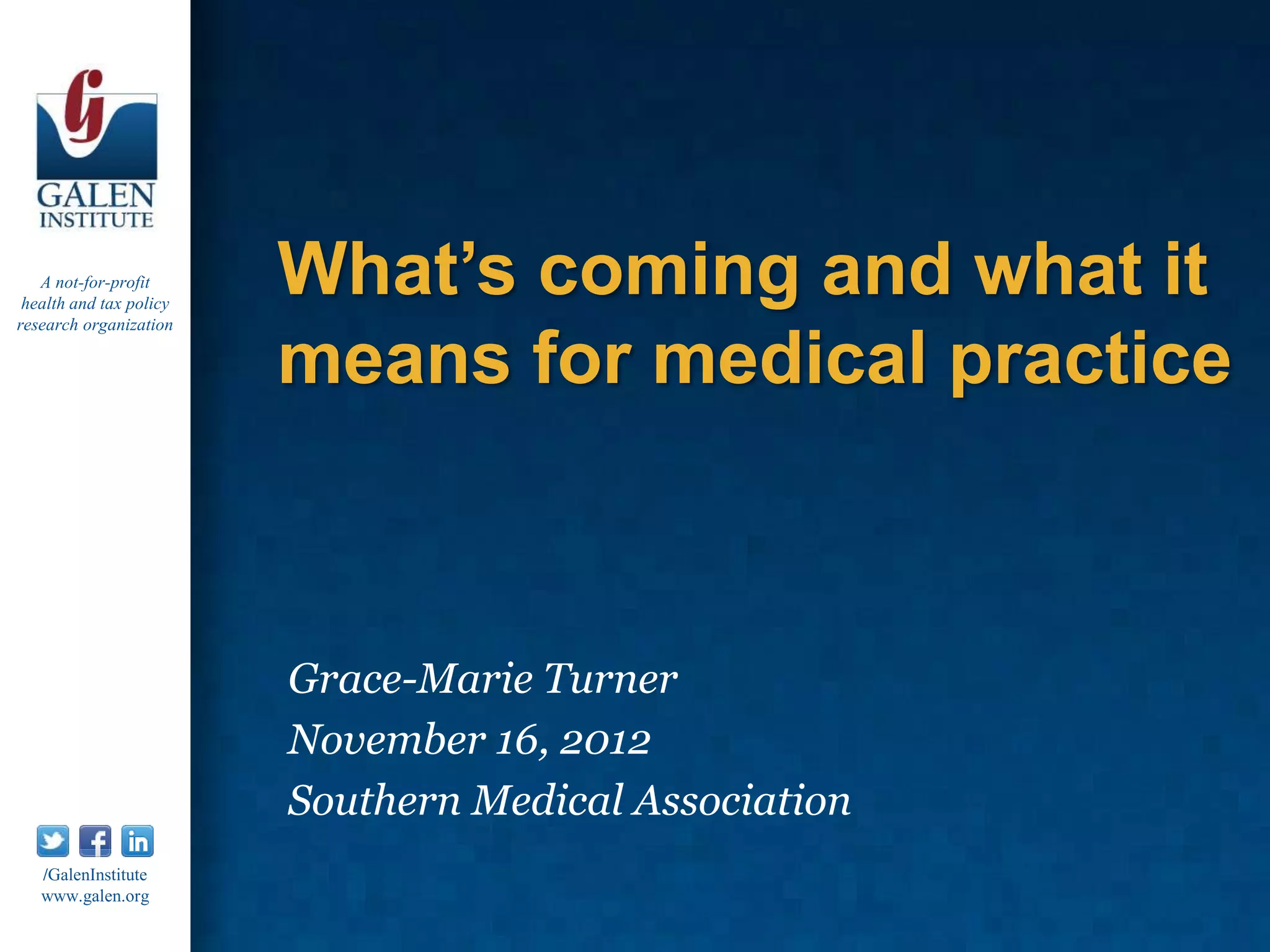 This document summarizes key points from a presentation on the impacts and implications of the Affordable Care Act (ACA) given to the Southern Medical Association. It discusses Americans' negative views of the law and its impacts on taxpayers, businesses, doctors, and those with insurance. It also outlines provisions of the law related to taxes, subsidies, and regulations that will impact medical practice. Physicians are concerned about new rules and costs reducing care quality. The presentation argues for market-based reforms rather than the government approach in the ACA.