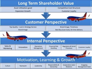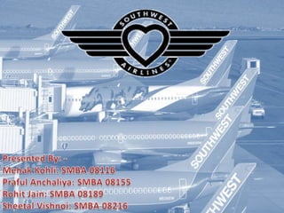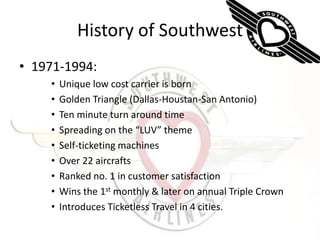 Southwest Airlines was founded in 1971 with a unique low-cost business model focused on quick turnarounds and customer satisfaction. It spread throughout the "Golden Triangle" region of Texas and emphasized a fun-loving culture. Southwest achieved great financial success in the 1990s and developed a reputation for excellent customer service. It continues to focus on low costs, high employee satisfaction, and putting customers first.