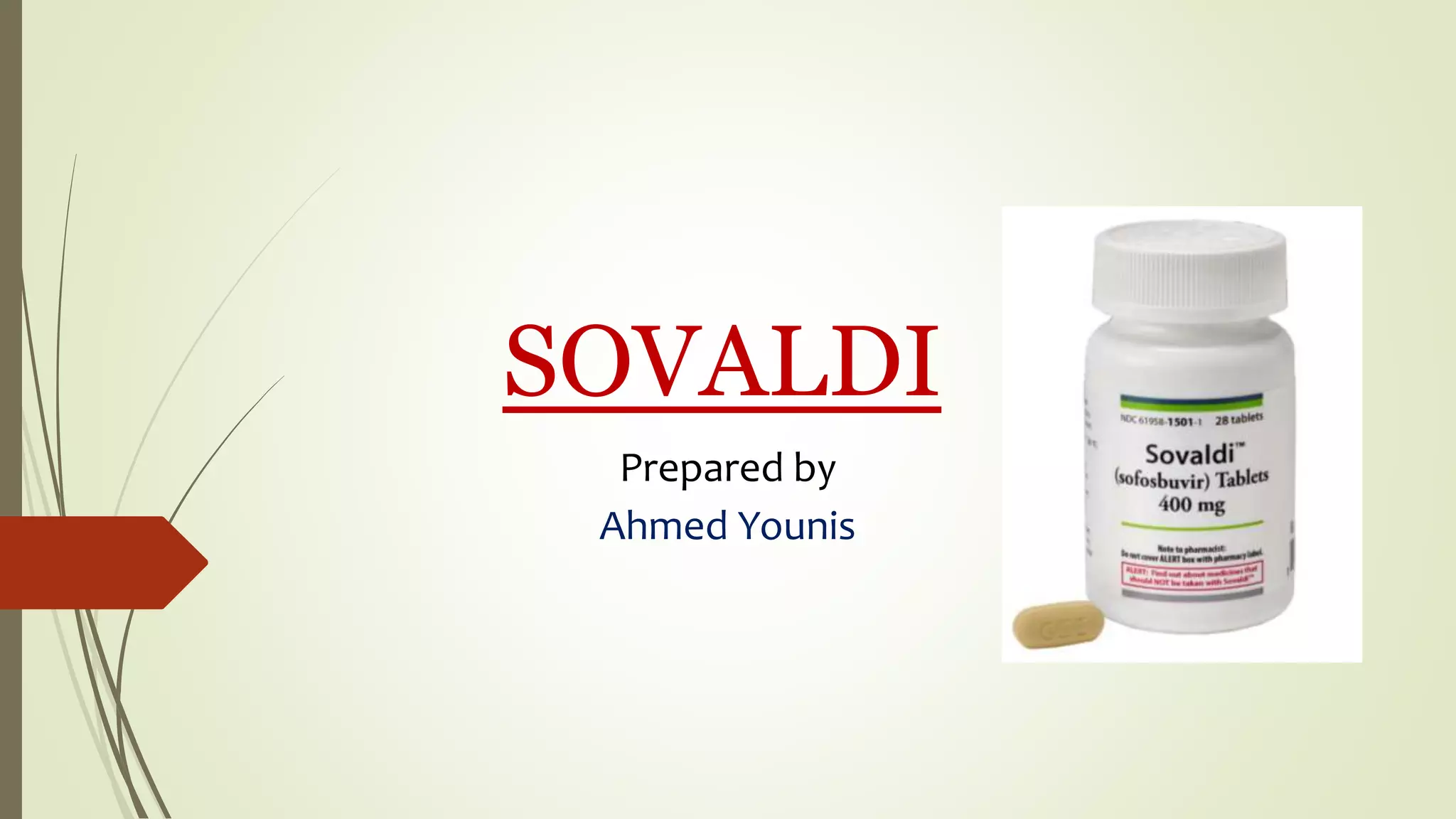 The document provides an overview of hepatitis C, detailing its causes, treatment options for both acute and chronic forms, and the mechanism of action of the antiviral drug Sovaldi (sofosbuvir). Sovaldi is a nucleotide analog that inhibits the hepatitis C virus's viral protein, aiding in virus elimination with high effectiveness when used in combination with other antivirals. Egypt has a particularly high prevalence of hepatitis C, underscoring its public health significance.
