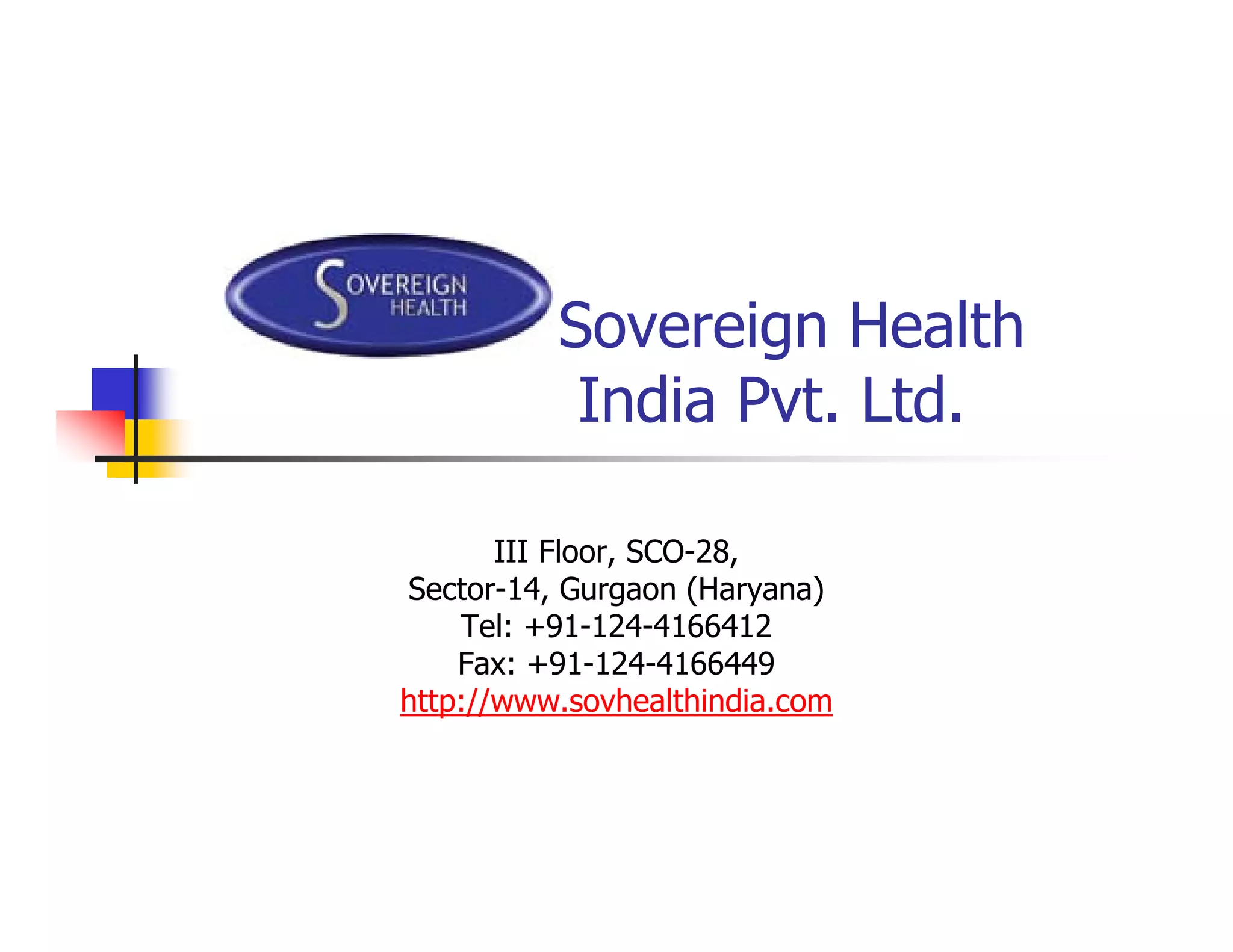 Sovereign Health is a clinical trial management organization in India that provides clinical research services to pharmaceutical, biotech, and medical device companies. It has experience conducting trials across many therapeutic areas in India and aims to generate high-quality, compliant research data. Sovereign Health has an extensive network of over 600 investigators across India and staff to support trials from project management to regulatory services. It works to ensure client satisfaction and quality trial conduct through internal monitoring, training programs, and 24/7 customer support.