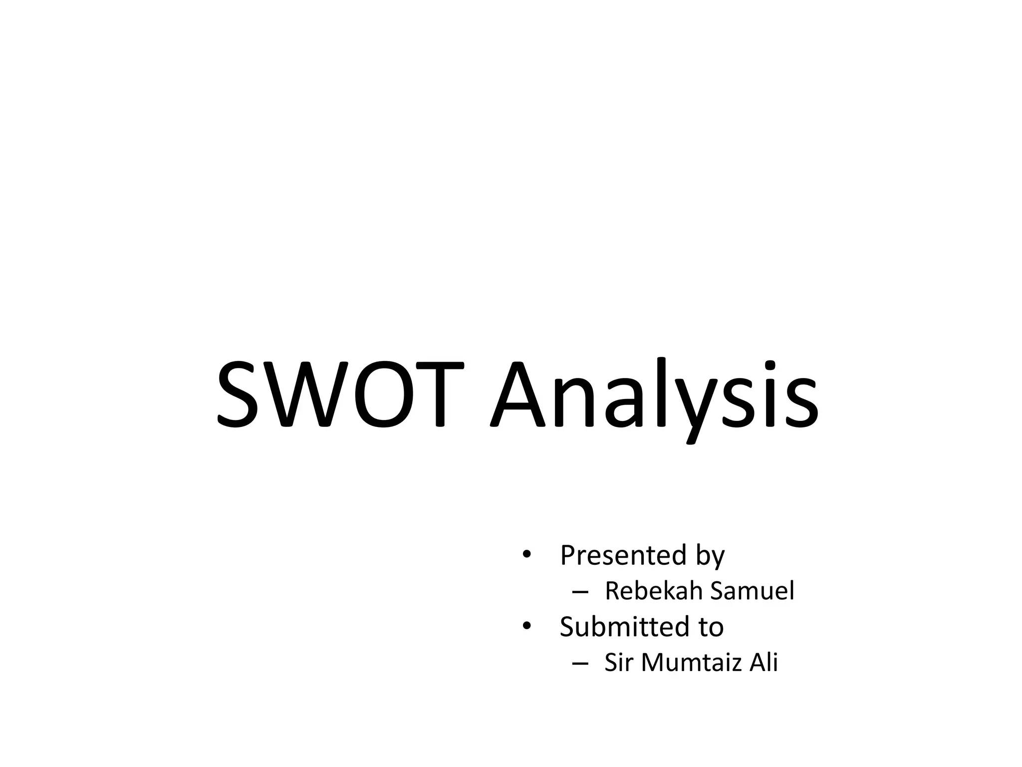 This document provides an overview of a SWOT analysis. It explains that a SWOT analysis links internal advantages/disadvantages with external environmental factors to understand a business's strengths, weaknesses, opportunities, and threats. Strengths and weaknesses are internal, like market share or product quality. Opportunities and threats are external, such as new markets or competition. The analysis identifies a firm's resources and capabilities as strengths or lack thereof as weaknesses. It also examines potential opportunities in the environment or threats from factors such as new technologies. The SWOT framework provides information to match a business's strategy to its competitive situation.