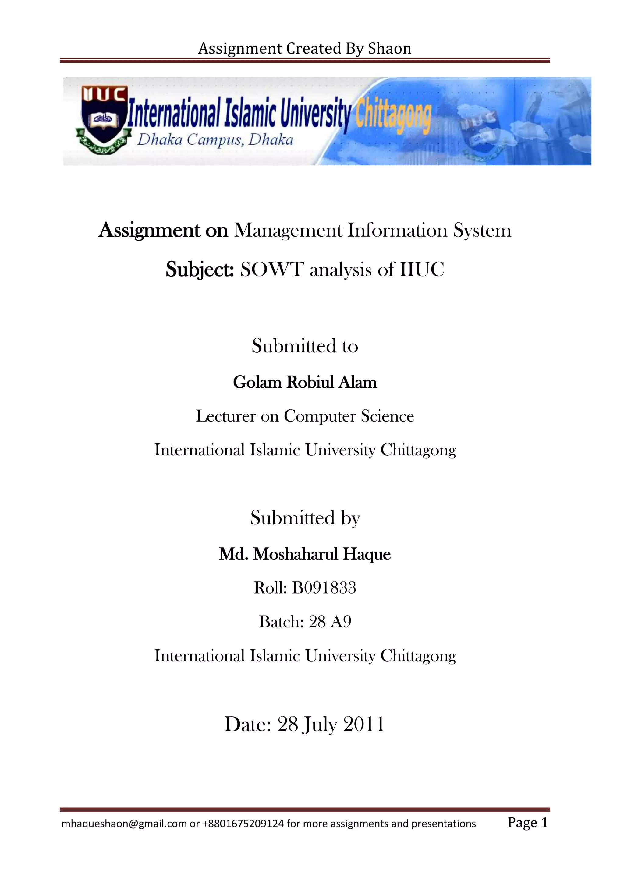 The document discusses a SWOT analysis of the International Islamic University Chittagong (IIUC).