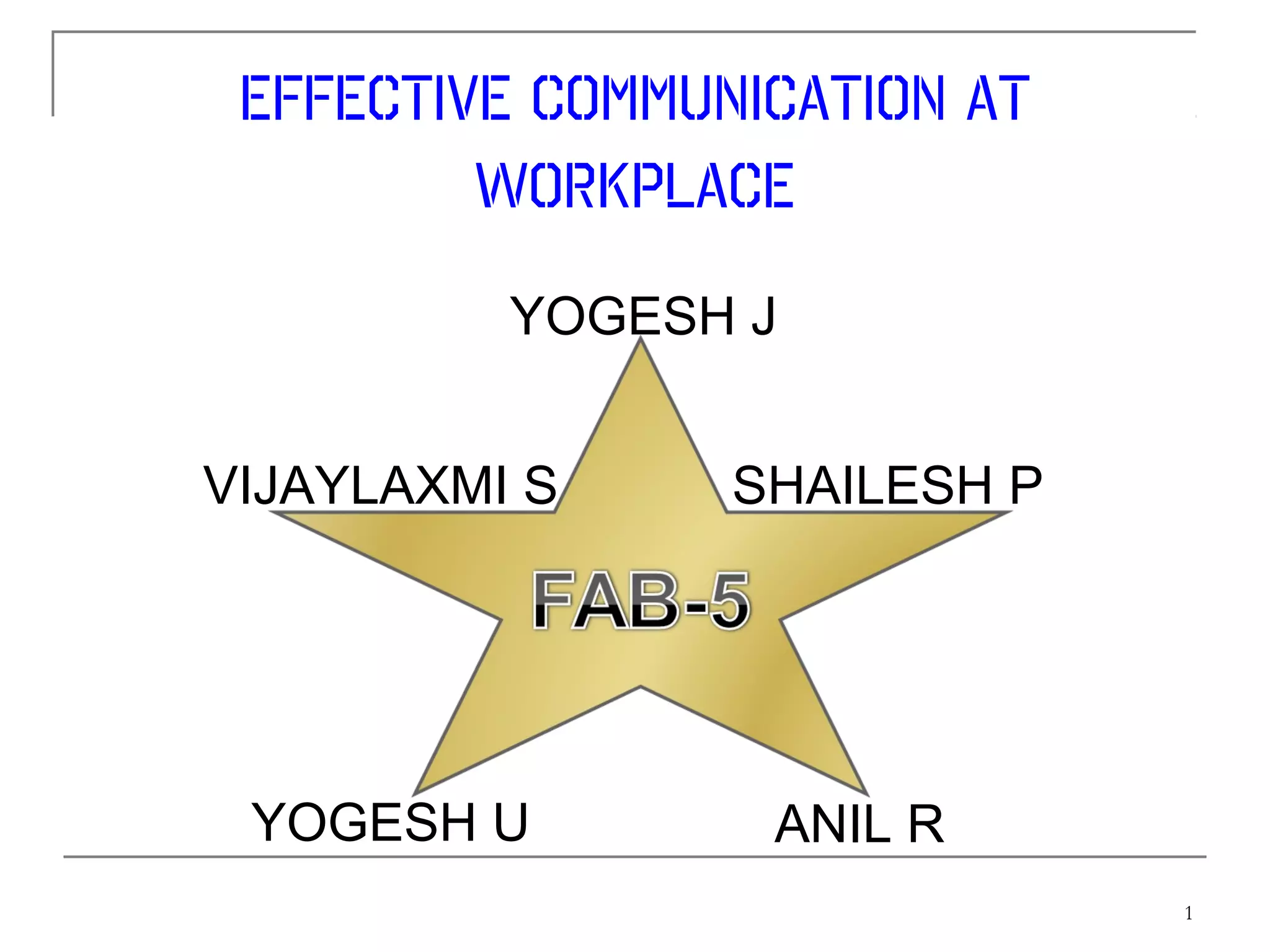 The document discusses effective communication in the workplace. It outlines the different flows of communication within an organization, including downward, upward, lateral, and diagonal. It describes the purposes and examples of each type of internal communication. The document also discusses external communication and different modes of verbal and non-verbal communication commonly used in organizations. Finally, it identifies some potential problems with communication and provides solutions to enhance effectiveness.