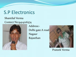 This document provides contact information for S.P Electronics, a mobile repair training center located in Nagaur, Rajasthan and run by Shantilal Verma and Prateek Verma. The center offers mobile repair services including iPhone unlocking, Android tablet repair, and repair of hardware and software for Windows Mobile and Android devices. Mr. Shantilal Verma can be contacted at phone number 9414216574.