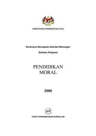 Dokumen ini menjelaskan sukatan pelajaran Pendidikan Moral 2000 di Malaysia yang bertujuan untuk membentuk murid berakhlak mulia dan bertanggungjawab sebagai warga negara yang berilmu ajaran moral. Ia menekankan nilai-nilai seperti patriotisme, hak asasi manusia, dan keharmonian melalui tujuh bidang pembelajaran yang mencakup aspek kemasyarakatan, budaya, dan alam sekitar. Kurikulum ini dirancang untuk mempersiapkan murid menghadapi cabaran abad ke-21 dengan menekankan kemahiran berfikir kritis dan penggunaan teknologi.