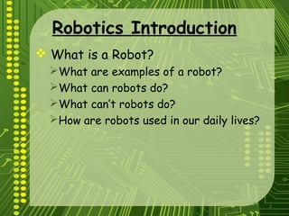 This document outlines the daily agenda and reflections for a 19-day robotics workshop using Lego Mindstorms NXT kits. Each day covers different robotics concepts like definitions of robots, sensors, processors, actuators and programming. Students build a tri-bot robot and learn programming concepts like touch sensors, sound blocks, loops and ultrasonic sensors. The agenda culminates in students designing final projects to demonstrate their learning, and a showcase for parents on the last day. Key topics covered include types of movement, writing directions, debugging programs and working as a team.