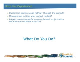 This document discusses how to build a change control system in SharePoint Project Management Information System (PMIS) using workflows. It describes the objectives of creating an automated change request process using the three-state workflow and developing a sophisticated change control system with custom workflows in SharePoint Designer. The document covers topics such as what is change control, SharePoint workflows, utilizing the three-state workflow, custom workflows in SharePoint Designer, and building a sample change control system.