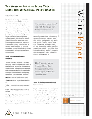 The document provides 10 actions that leaders must take to drive organizational performance. It summarizes each action in 1-2 sentences. The actions include establishing a strategic foundation, fostering communication, documenting responsibilities, defining competencies, strategic recruiting, setting expectations, continuous performance management, providing development opportunities, recognizing contributions, and soliciting feedback. Taking these actions aligns human capital practices with organizational vision, values and goals to improve results.
