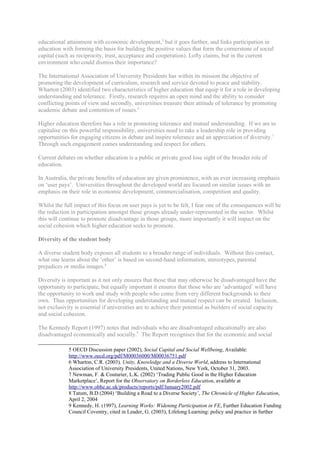 This document discusses the importance of diversity in higher education. It notes that universities have historically served elite, homogenous populations but are now more diverse due to policies increasing access. While participation has increased, not all groups are represented equally. The document argues that diversity is important for exposing students to different perspectives and building social cohesion. It provides examples of programs at Edith Cowan University aimed at increasing access for underrepresented groups. Overall, the document advocates for inclusion and equitable access to higher education.
