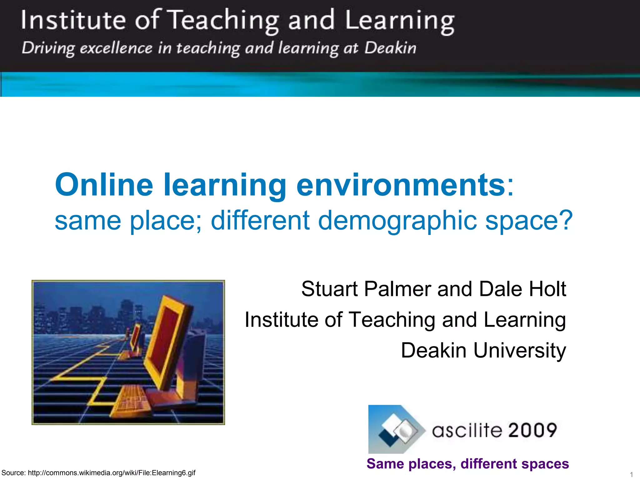 This document summarizes a study that investigated the impact of demographic differences on student experience with an online learning environment (OLE) at Deakin University. The study collected survey responses from over 2,500 students regarding importance and satisfaction ratings of various OLE elements. Key findings included: