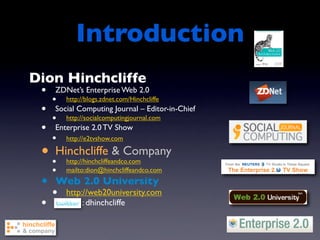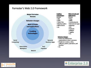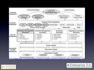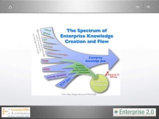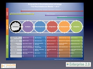 The document discusses the concept of Enterprise 2.0 and its potential to enhance business productivity and innovation through social computing methodologies. It outlines the challenges organizations face in adopting these strategies, such as cultural barriers and the need for effective community management. The paper emphasizes the low maturity level in current enterprise practices and advocates for tailored approaches in implementing Enterprise 2.0 processes to maximize outcomes.