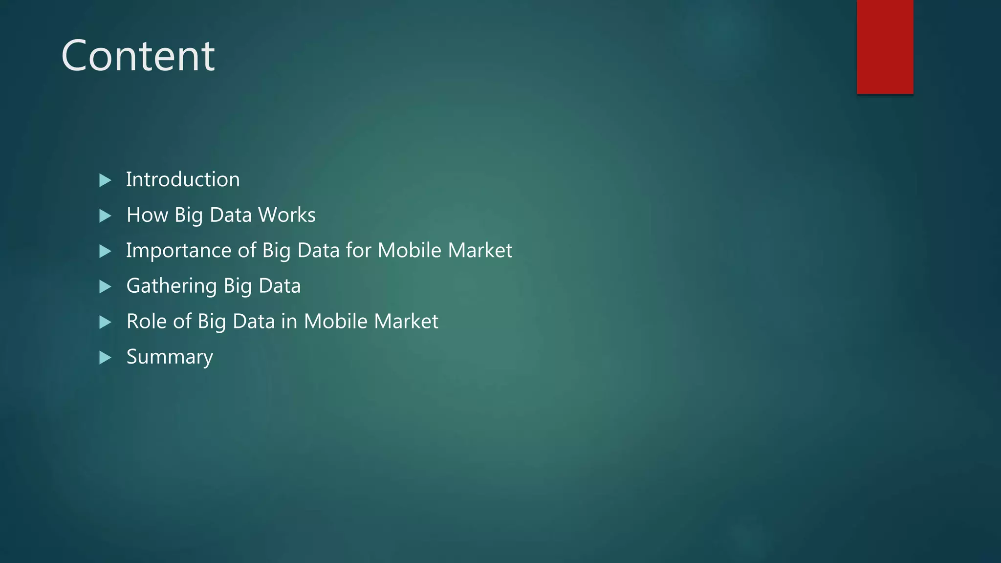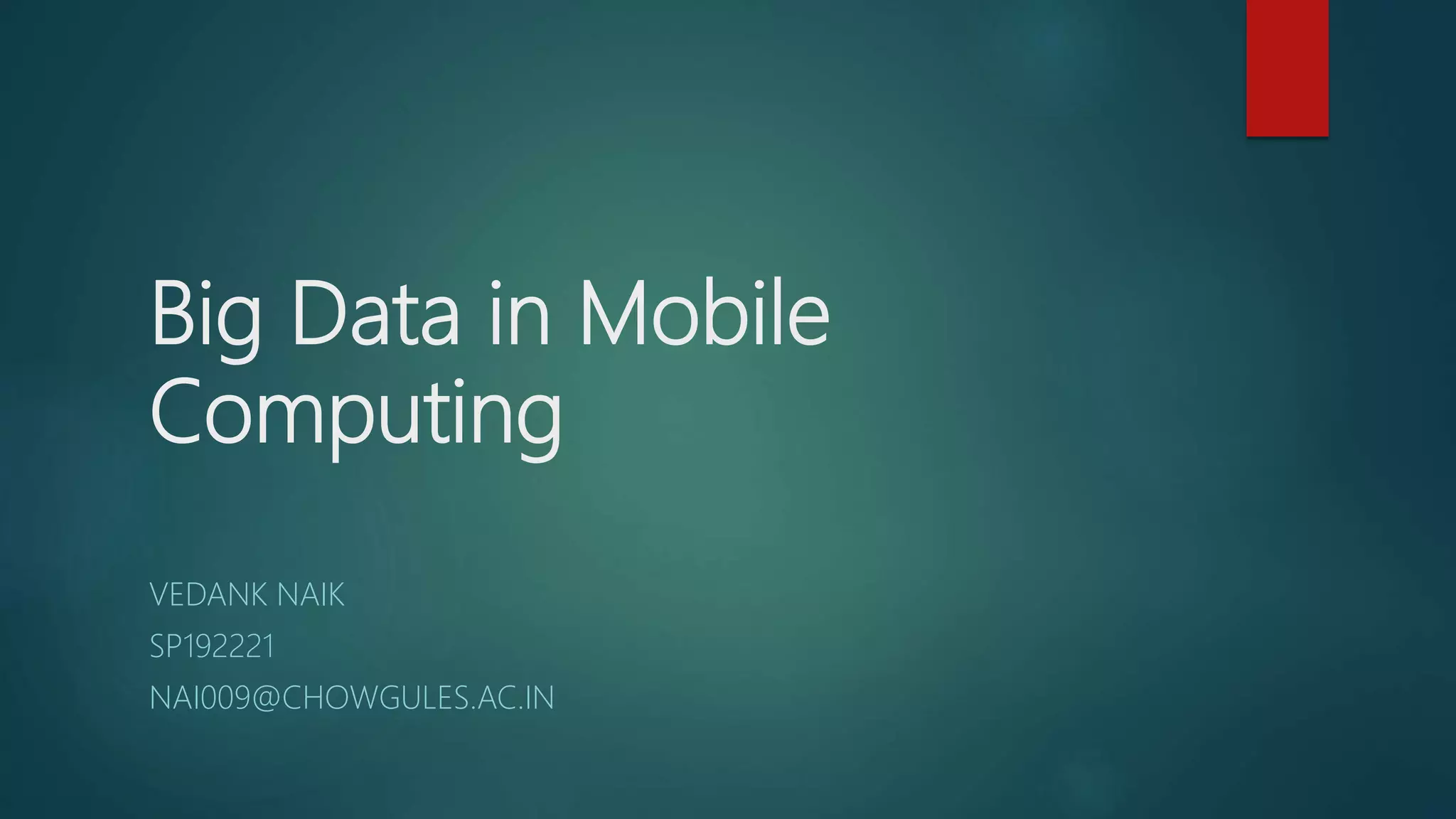 Big data refers to large and diverse data sets that are analyzed to reveal insights. This document discusses how big data is important for the mobile market. It is gathered from various sources like loyalty programs, social media activity, emails, and sensors in phones. Big data helps mobile applications meet customer expectations, analyze user experience, access real-time data, improve revenue, and personalize services. Industries like retail, healthcare, and banking widely use big data. It will transform future mobile apps by helping businesses understand user needs better.
