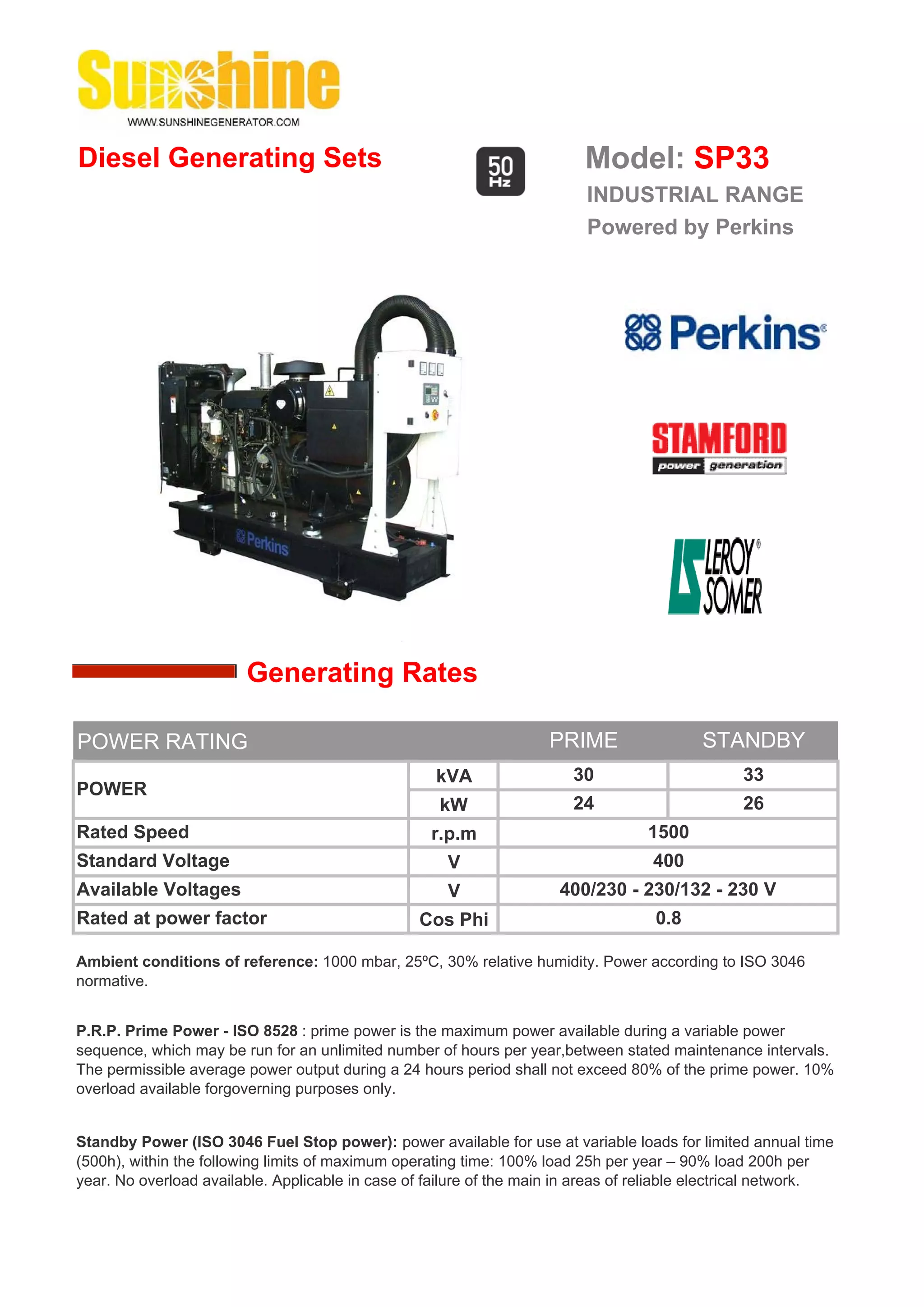 This document provides specifications for a diesel generating set model SP33 in the industrial range powered by a Perkins engine. It has a prime power rating of 30 kVA and standby power rating of 33 kVA at 1500 rpm. The generator set consists of a 3-cylinder Perkins 1103A-33G engine and a Leroy Somer or Stamford alternator, with an automatic mains failure control panel. Key features include a soundproof and weatherproof canopy, integrated steel base, and voltage regulation maintained within ±0.5% from no load to full load.