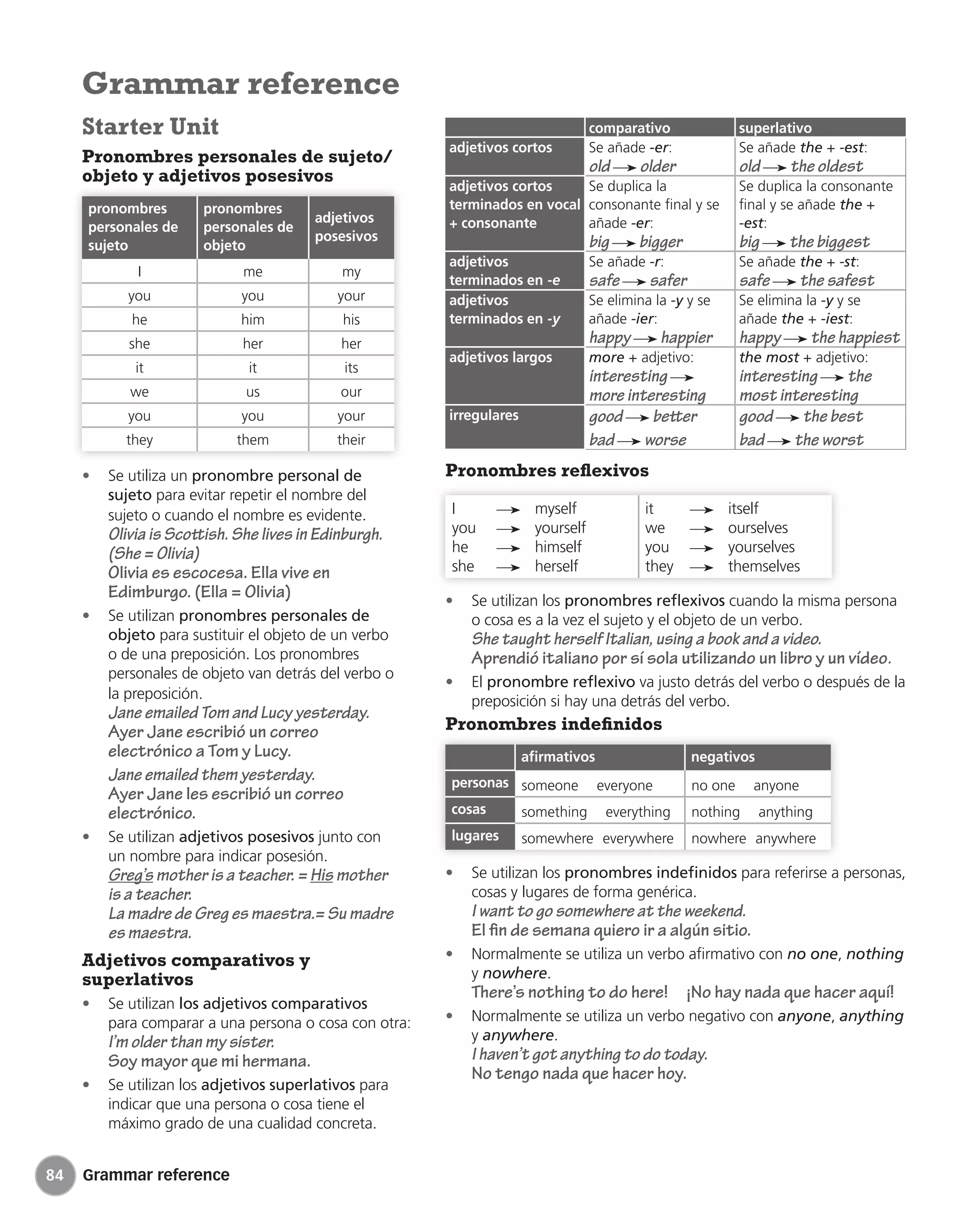 This document provides information on pronouns, possessive adjectives, comparative and superlative adjectives, reflexive pronouns, indefinite pronouns, and expressions of frequency in Spanish grammar. It defines these grammatical concepts and provides examples of their use. It also includes practice exercises for students to reinforce their understanding.