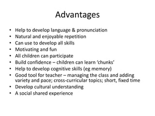 Using songs in the classroom has several advantages: it helps develop language and pronunciation skills, provides natural and enjoyable repetition, and motivates and engages students. Songs build confidence as students can learn "chunks" of language. They also help develop cognitive, cultural, and social skills. When selecting songs, teachers should consider their students' level, age, classroom space, and when and how the songs will be used. Popular activities include singing, listening games, writing activities, and adapting songs for topics. Many online resources offer song suggestions.