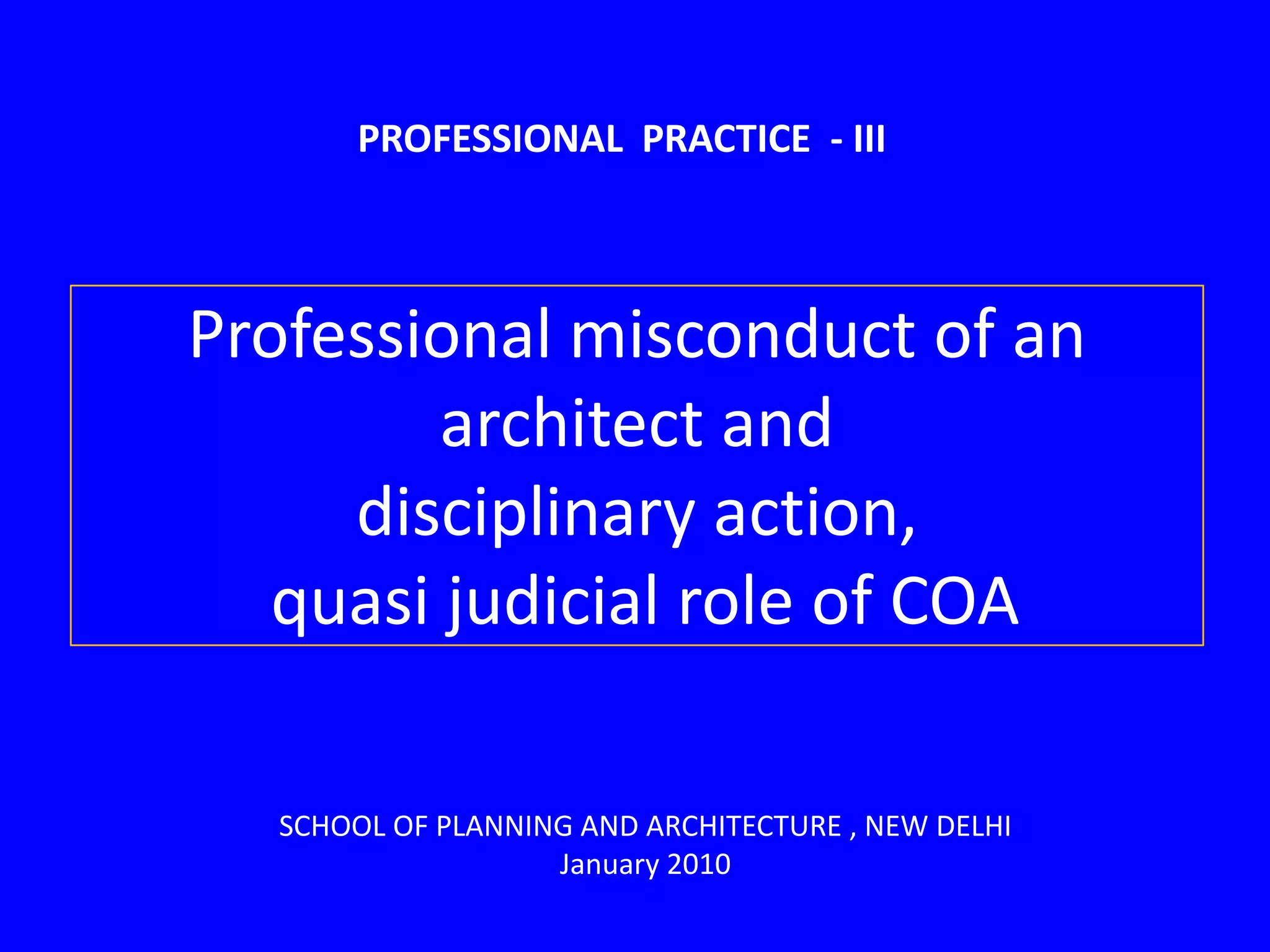 The document summarizes the process and procedures for handling professional misconduct complaints against architects in India according to the Architects Act of 1972 and the Council of Architecture Rules of 1973. It involves a disciplinary committee that investigates complaints, reports its findings to the Council of Architecture, which can then reprimand, suspend, or remove architects found guilty of misconduct. The entire process from initial complaint to final punishment can take up to 450 days. Issues with the current system include the lengthy time frame and lack of an appeals process. Further study is needed to determine if amendments should be made to streamline procedures and address these issues.