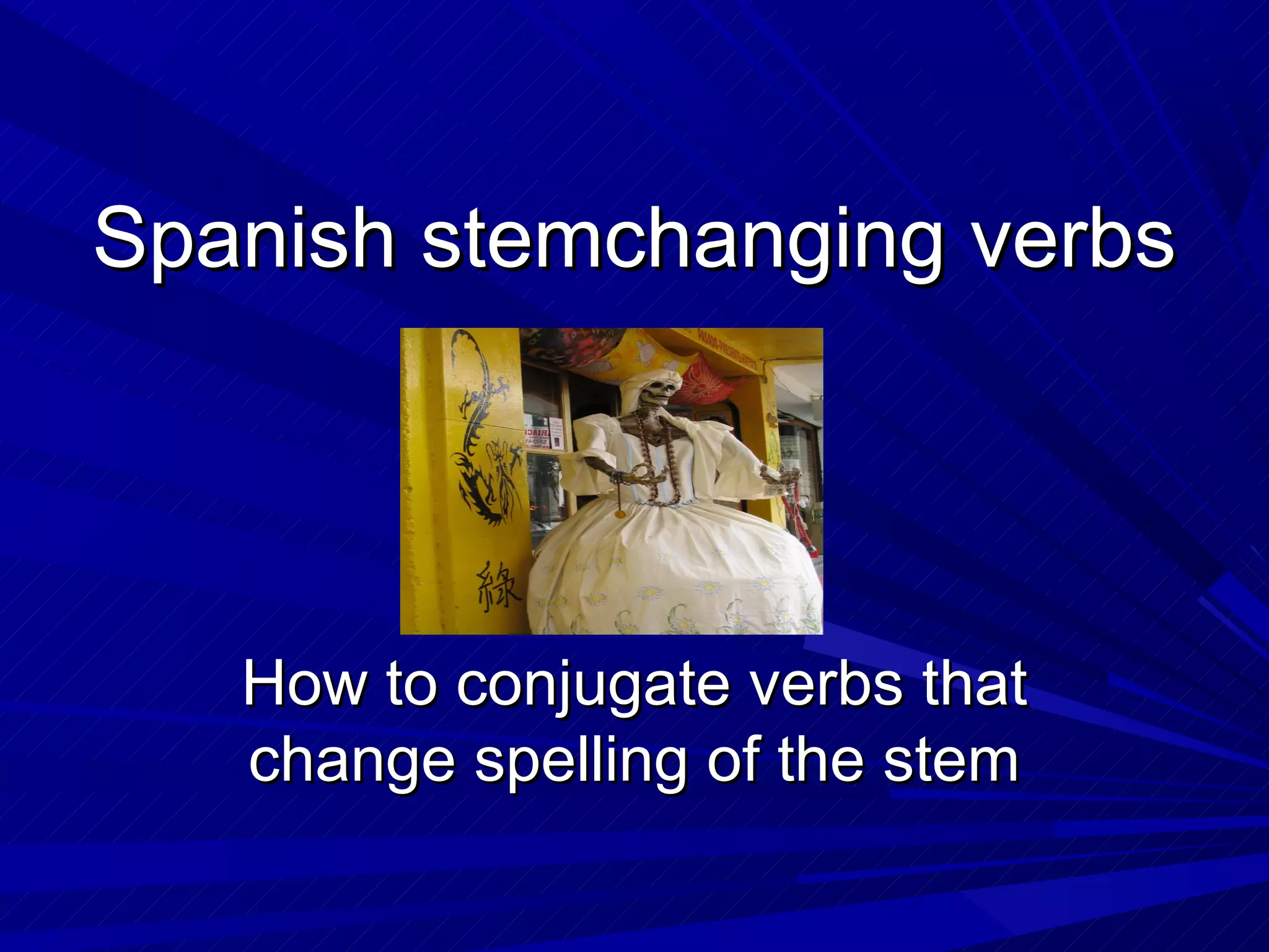 This document provides information about Spanish stem-changing verbs. It explains that stem-changing verbs change the spelling of the stem in certain conjugations, unlike regular verbs which do not change the stem. It identifies two types of stem-changing verbs - those where the stem changes from e to ie, and those where it changes from e to i. The document concludes by encouraging practice of verb conjugations and providing a link to a conjugation practice website.