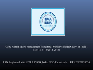 Sports Academy Association of India (SPAA) was established in 2015 to develop sports education in India. SPAA has developed undergraduate and postgraduate programs in sports management with copyright approval from the Ministry of Human Resource Development. SPAA's programs aim to provide professional and employable training to Indian youth interested in sports so they can work in sports event organization and sports industry careers. SPAA works with universities and institutions in India, Nepal, and Bangladesh and has a team of sports professors, coaches, and professionals from India and other countries.