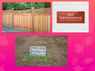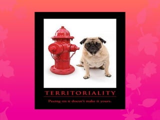 3) Cultural norms around personal space and territoriality can depend on climate, with colder northern cultures typically preferring more physical distance than warm weather Mediterranean cultures. Reactions to perceived invasions of territorial space also vary cross-culturally.