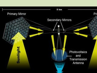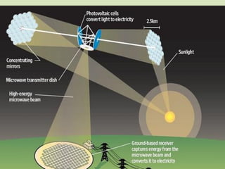 Space-based solar power (SBSP) collects solar power in space using solar satellites and beams it to large rectennas on Earth. SBSP has been researched since the 1970s as a potential future energy option that could provide abundant, continuous solar power without atmospheric or weather effects. While extremely expensive currently, SBSP could solve global energy needs long-term by tapping into the vast solar resources available in space.