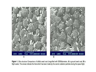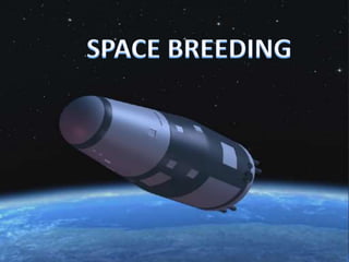 Space breeding involves sending seeds into low-Earth orbit to induce mutations from cosmic radiation and microgravity. Returning seeds are selected and bred to develop varieties with desirable traits like higher yield, disease resistance, and stress tolerance. China has been a pioneer in this area, sending over 400 plant species to space and developing commercial rice and vegetable varieties from space-bred seeds. The goals of space breeding are to efficiently produce new crop varieties with improved economic traits that are difficult to obtain through traditional breeding methods.