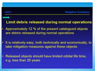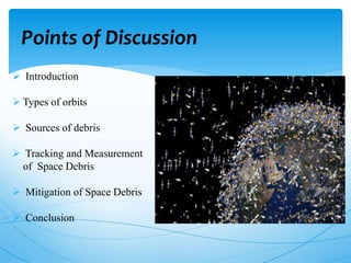The document presents an overview of the space debris removal system developed by the Department of Electronics and Communication Engineering at Krishna Institute of Engineering and Technology. It discusses the types of orbits, sources of debris, associated risks, tracking mechanisms, and potential mitigation strategies for space debris. The document concludes with ongoing research and development efforts, highlighting the importance of addressing the increasing threat of space debris to satellites and orbital operations.